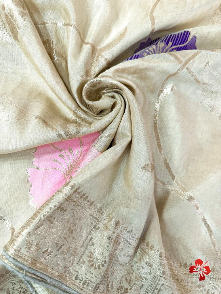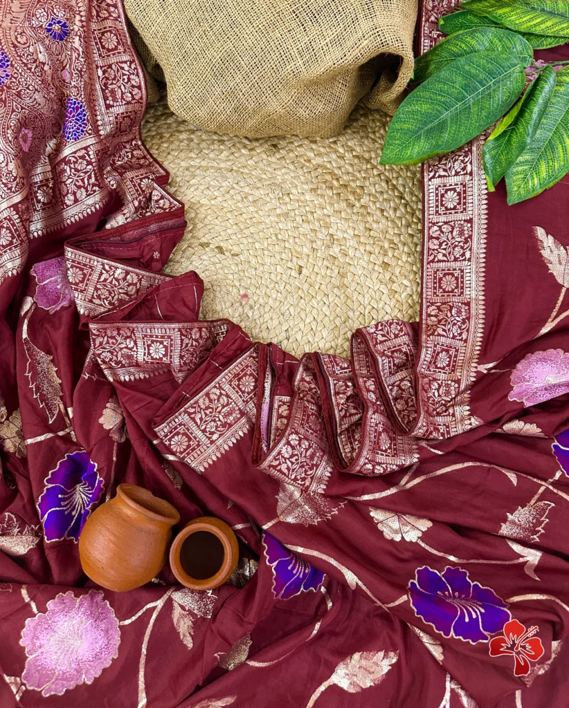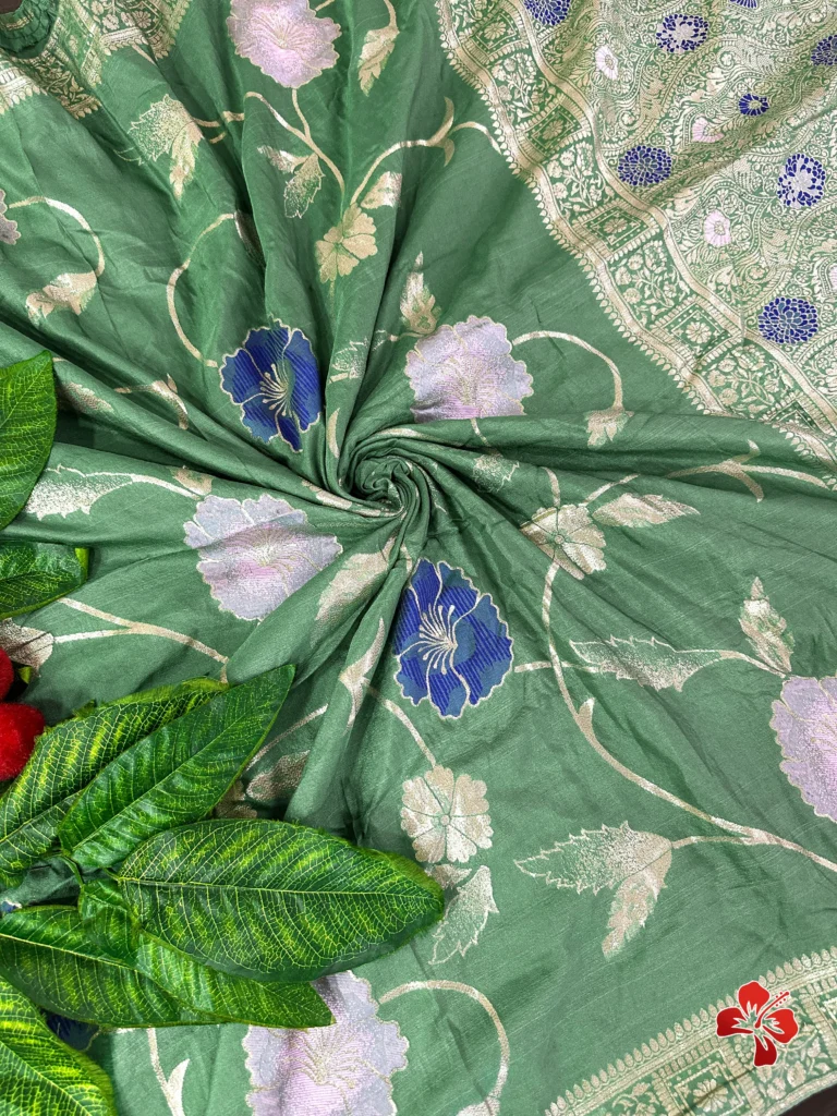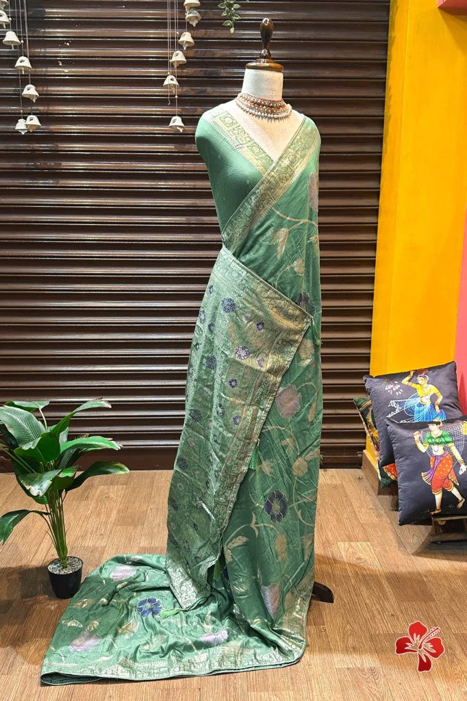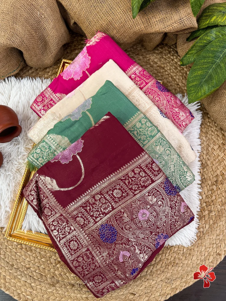 Here is  a rich and Premium Moonga Soft Silk saree with all over Resham weaving in the body  Border with piping lace and woven pallu with tassels