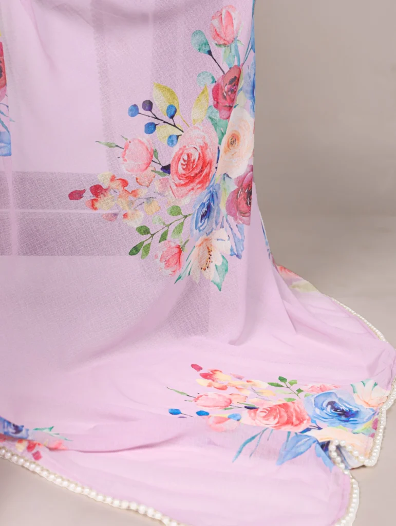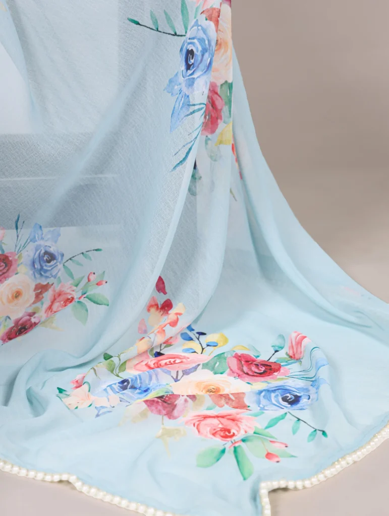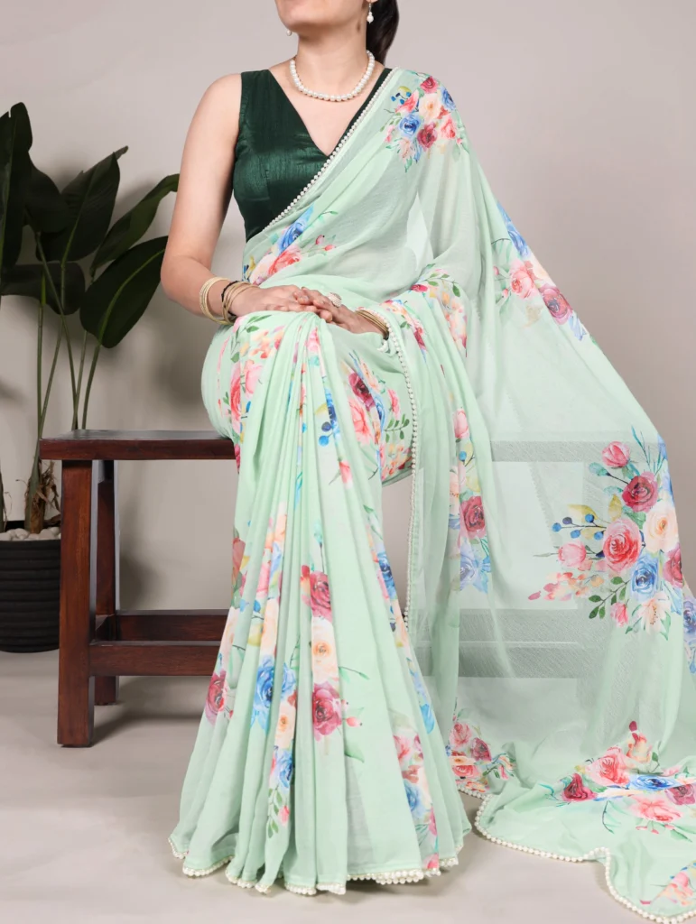 Rich Marbel Chiffon Sarees that gives chic look and having Floral printed body, Saree is Soft ,Flowy and Silky
