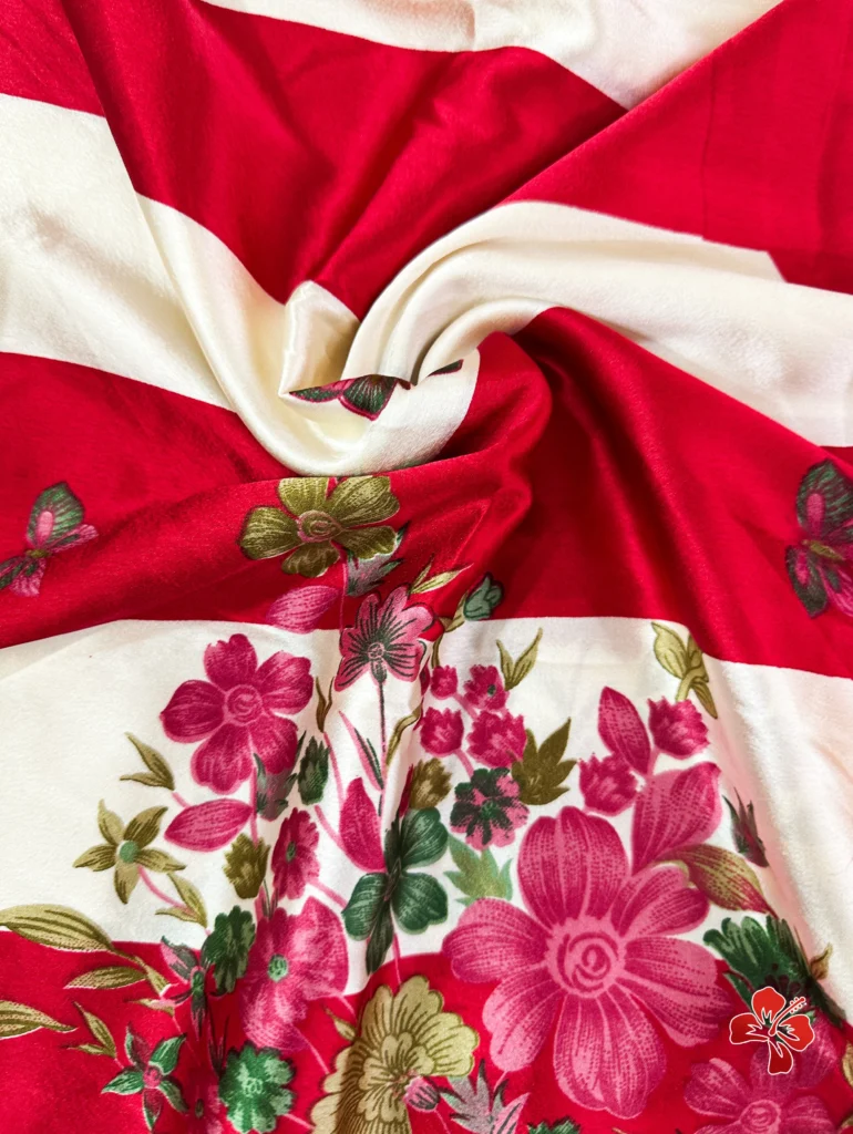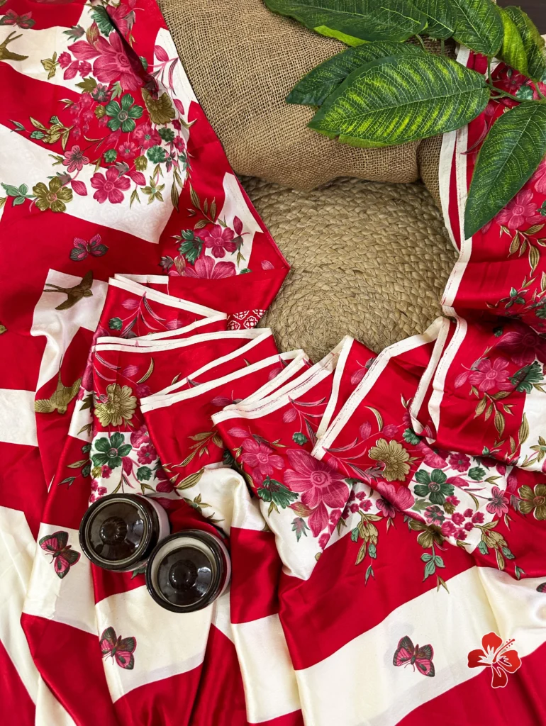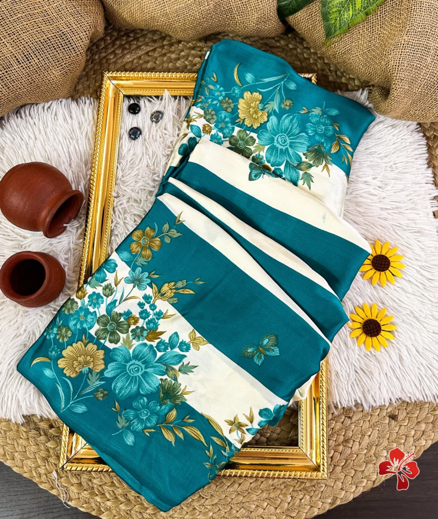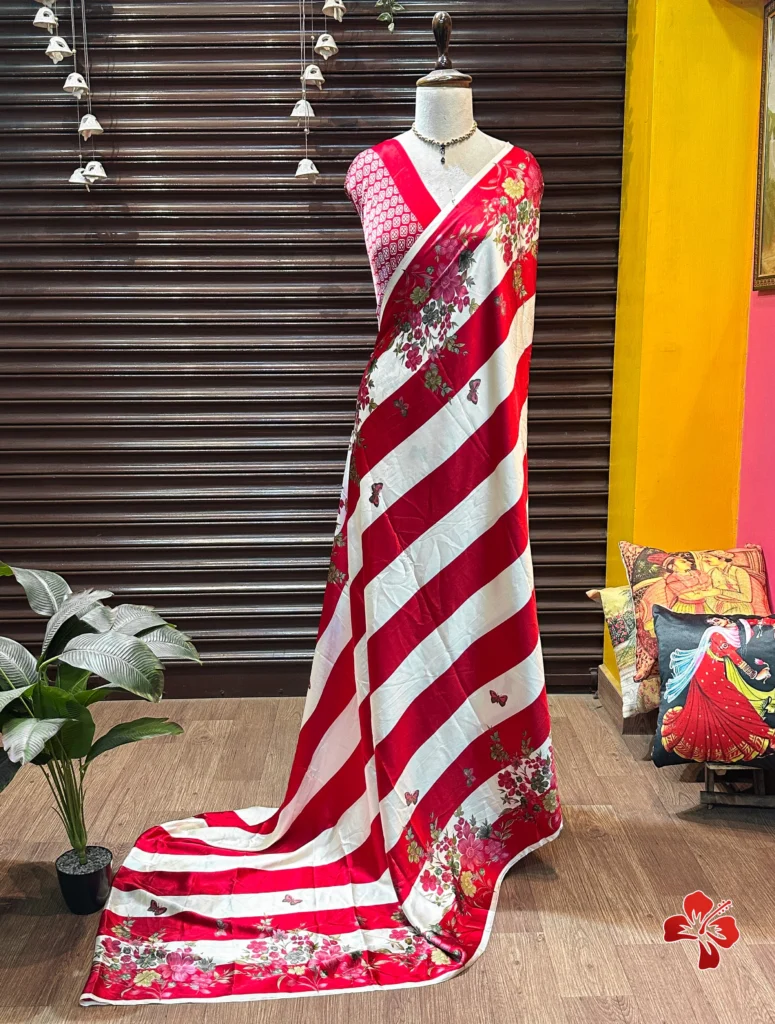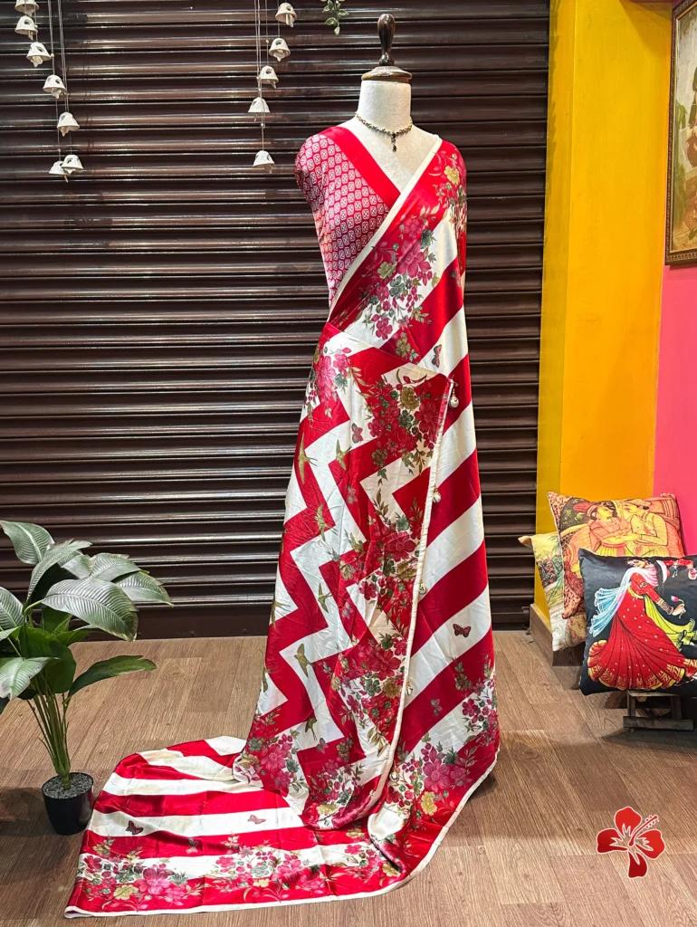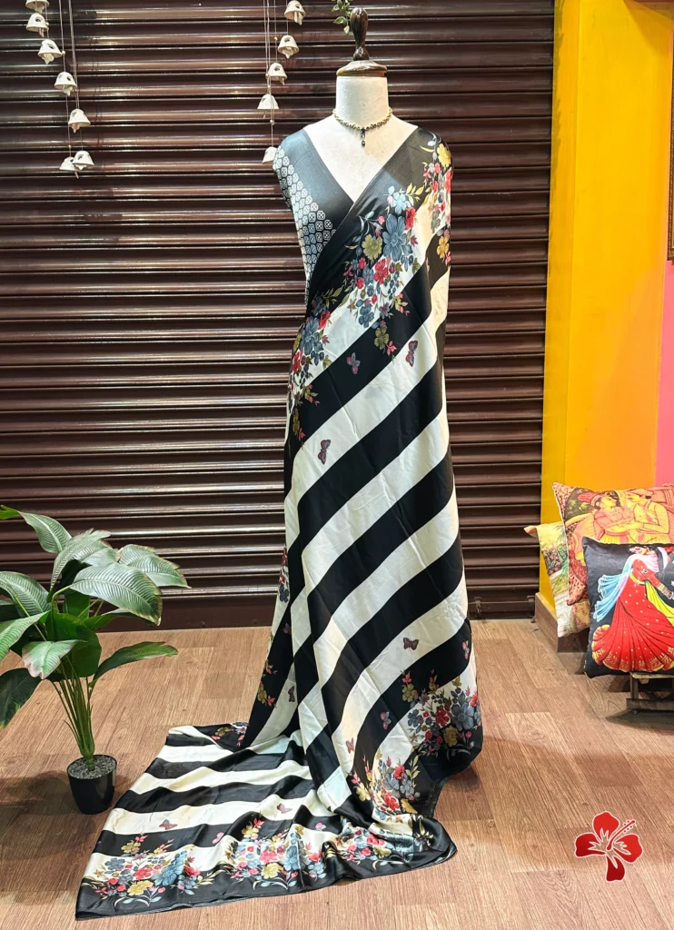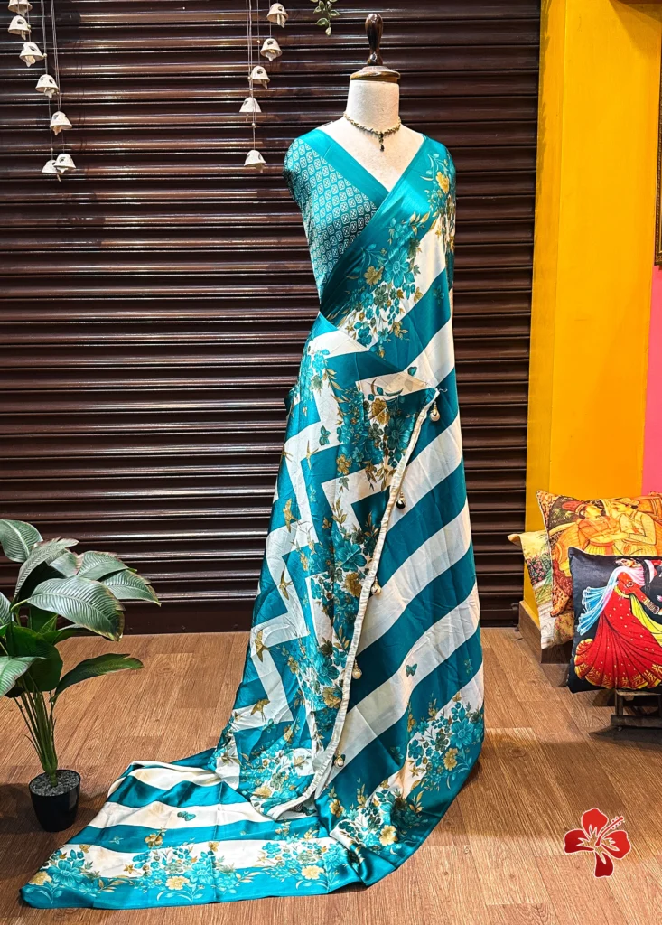 The rich and premium striped, floral conceptual printed Satin Crepe Silk sarees with Heavy Ball Handmade Tassels that resembles Trisha saree