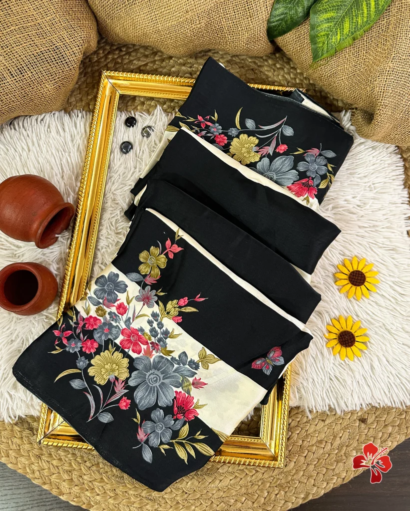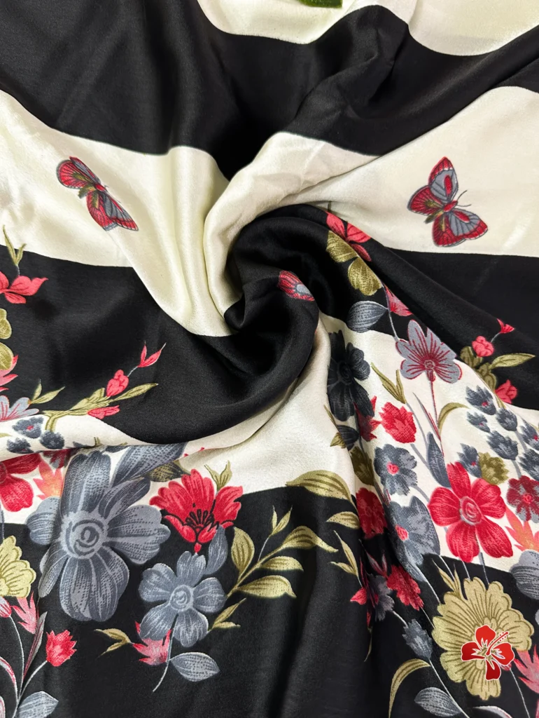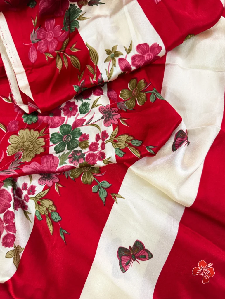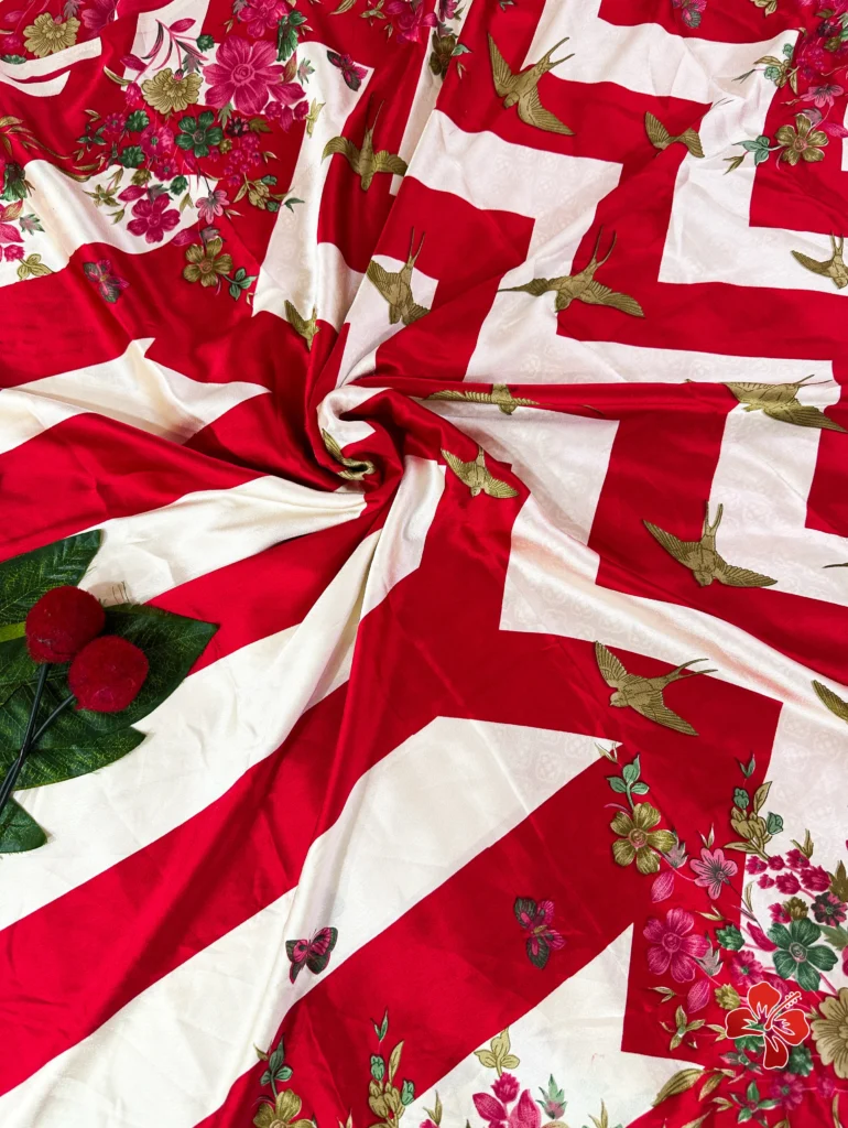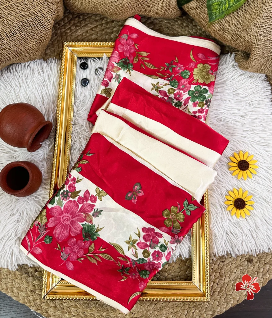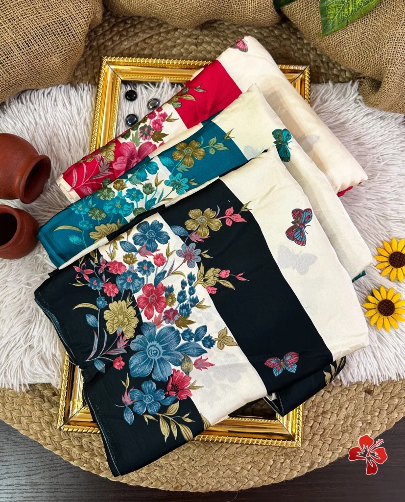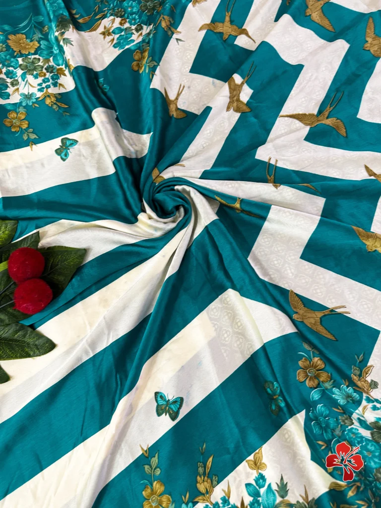The rich and premium striped, floral conceptual printed Satin Crepe Silk sarees with Heavy Ball Handmade Tassels that resembles Trisha saree