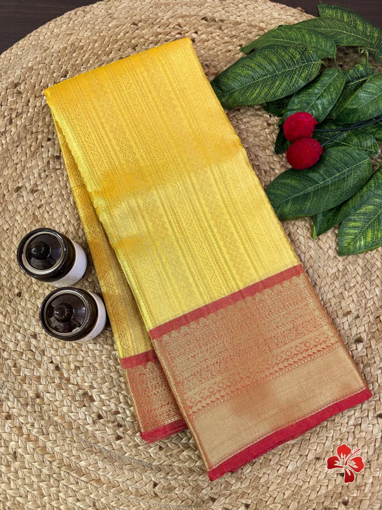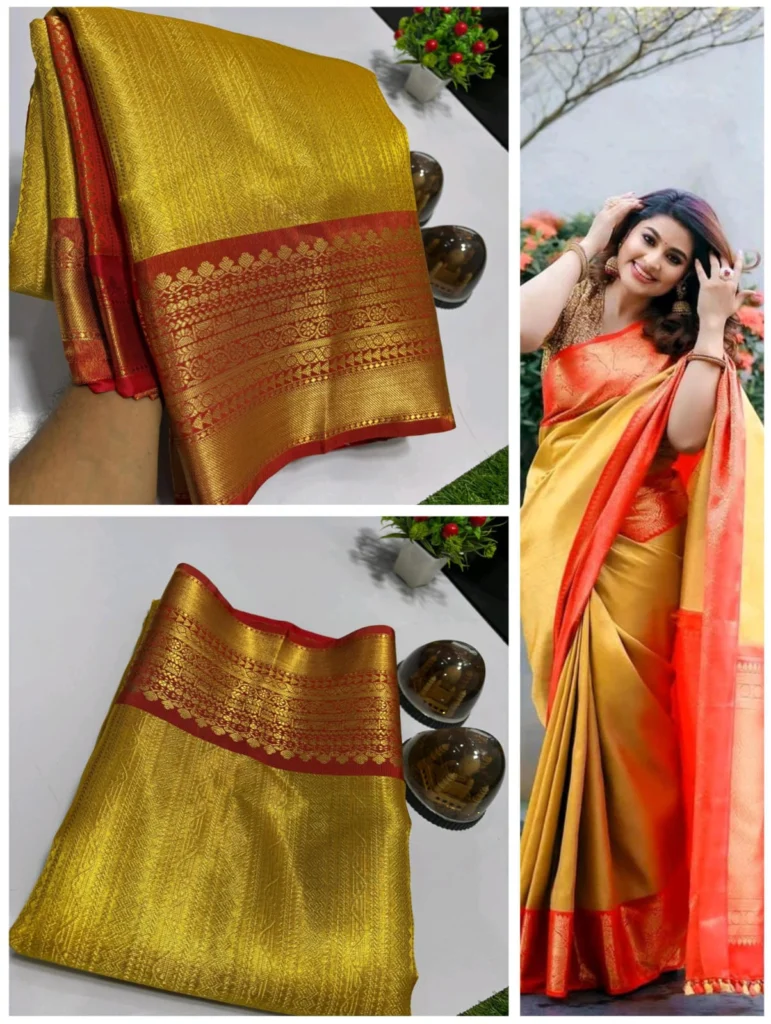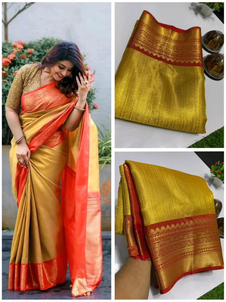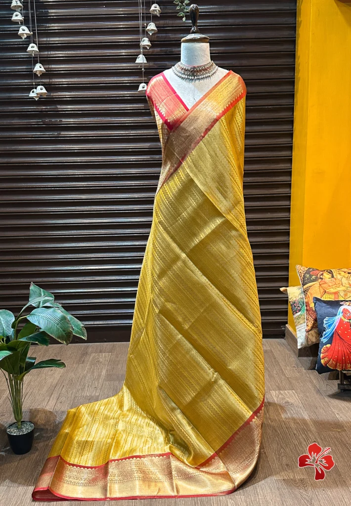 Classy Colour Combo, the Banarasi soft and rich silk tissue sarees with all over zari weaving in the body and Kanji Style Contrast Woven Border and Woven Pallu
