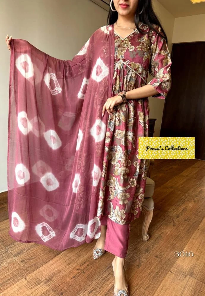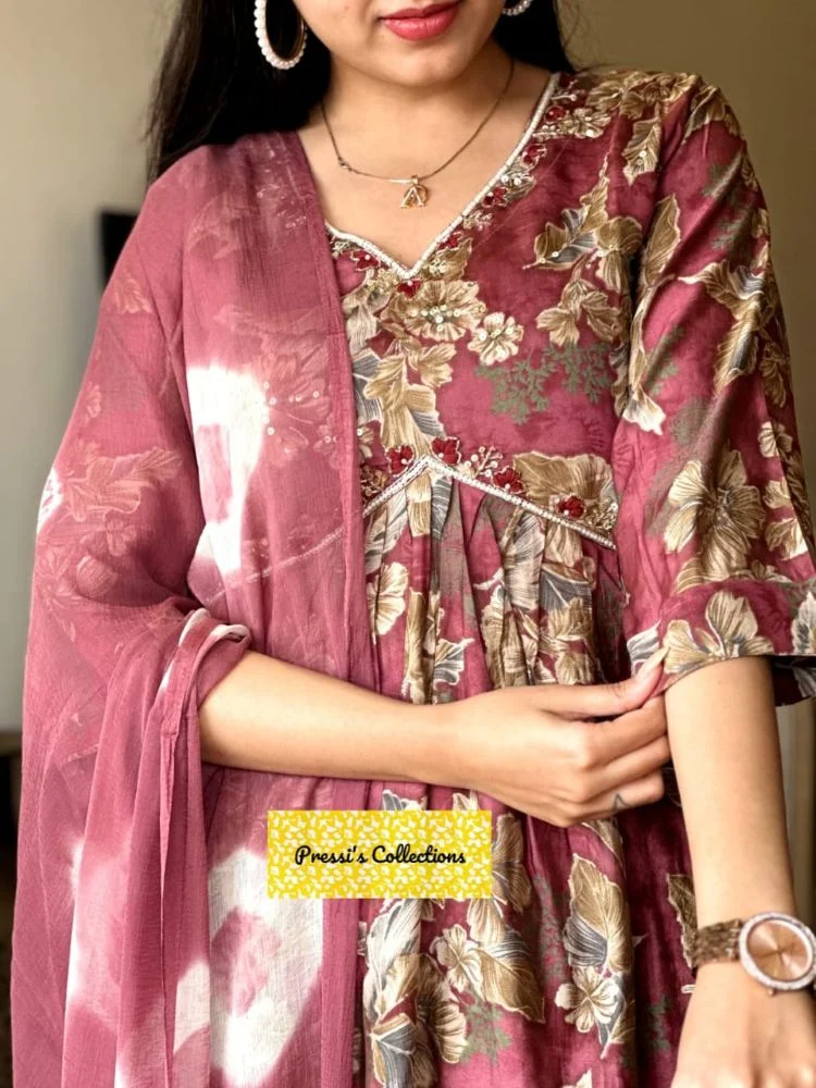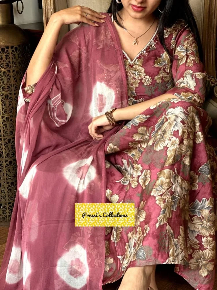 “Seize the day” with a classy floral printed soft model silk printed Alia cut A line suit (attached lining till choli) with modal silk pant paired with pure chiffon duppata.