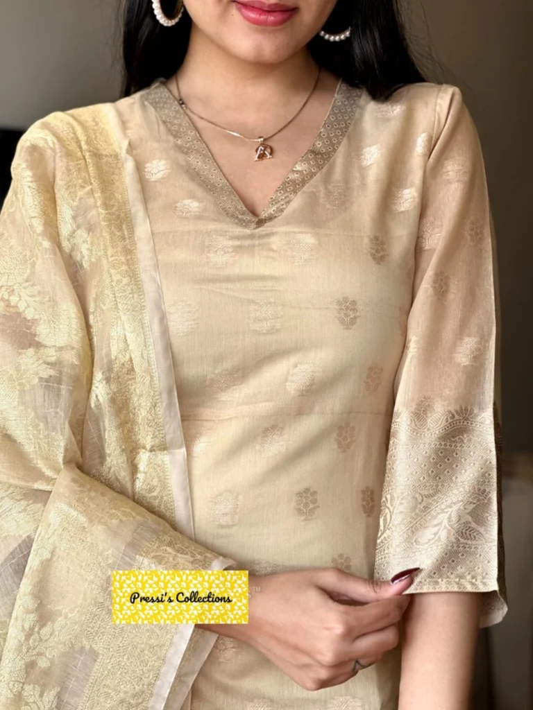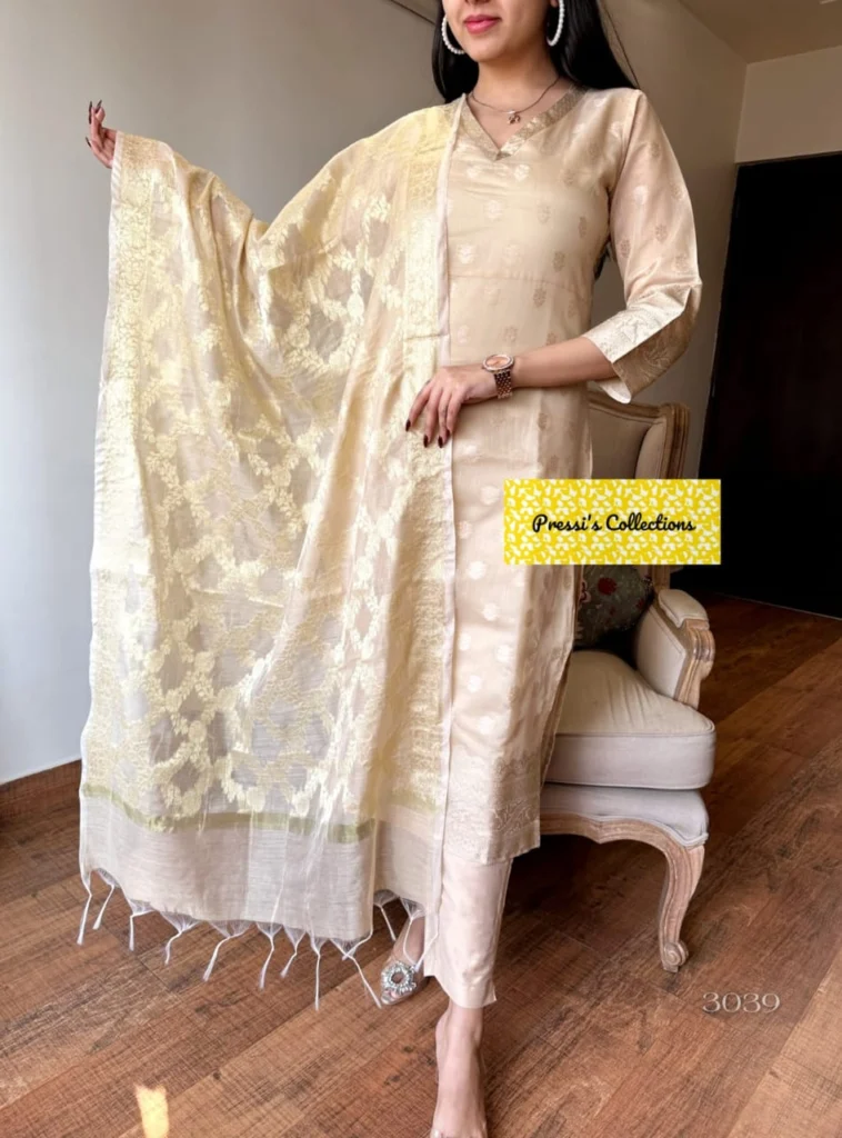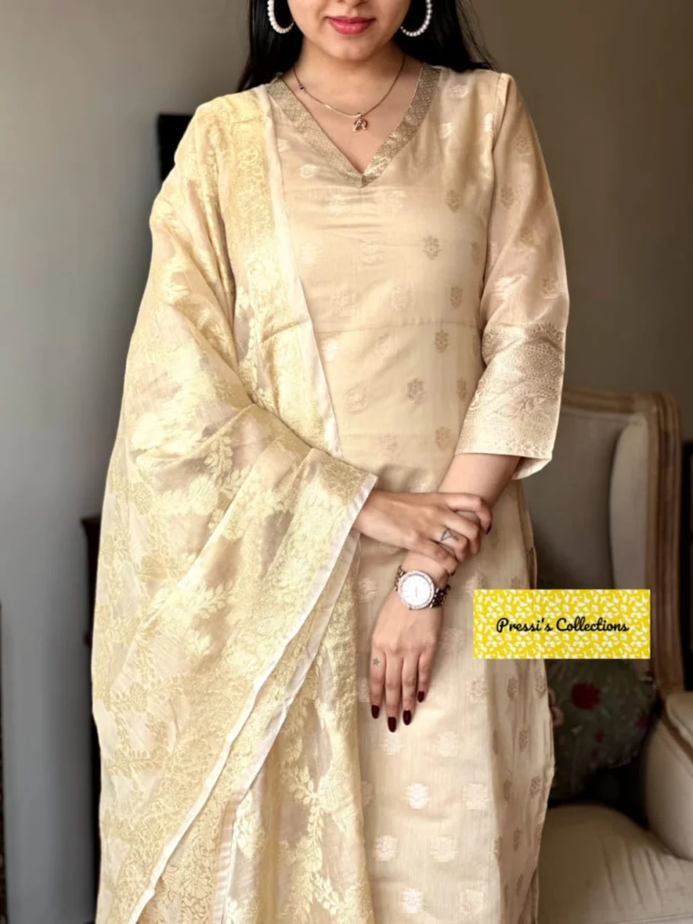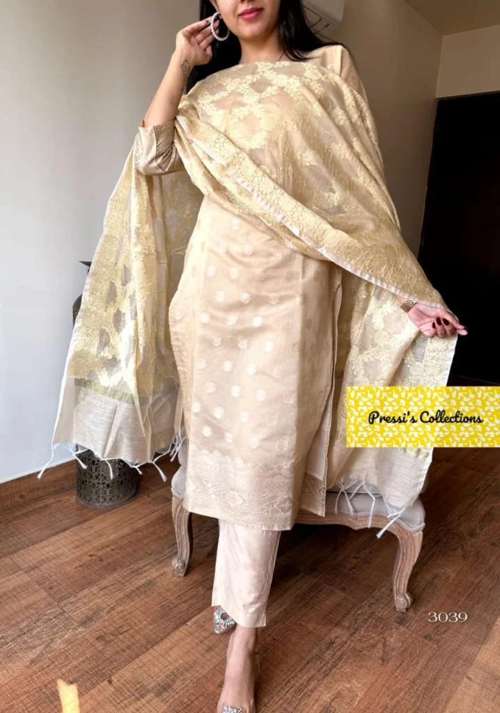 Elegant Pure Banarsi Silk,Jacquard,Self-Zari Thread, Banarsi suits are evergreen and must’ve in your wardrobe, so don’t forget to invest in this sophisticated design. This Suit Set is beautifully crafted.It is paired with matching Silk Pant and Pure Heavy Banarsi self-zari Jacquard Duppata