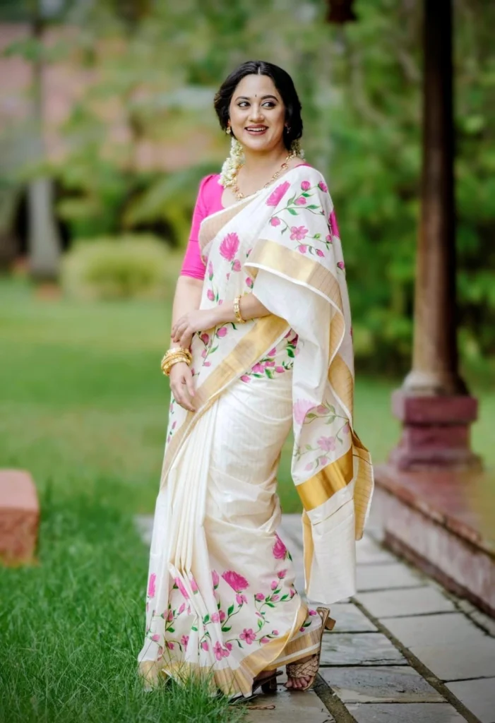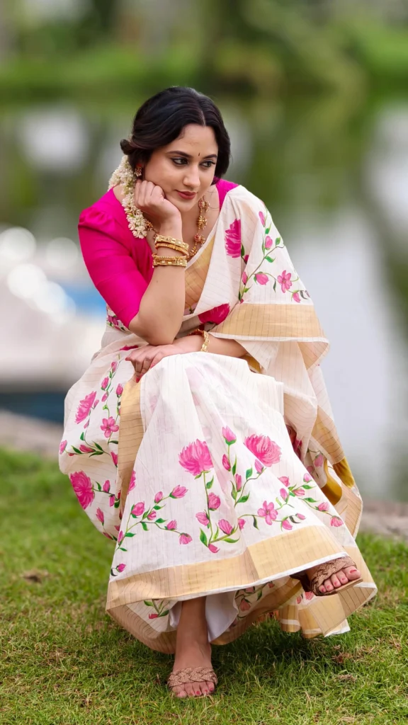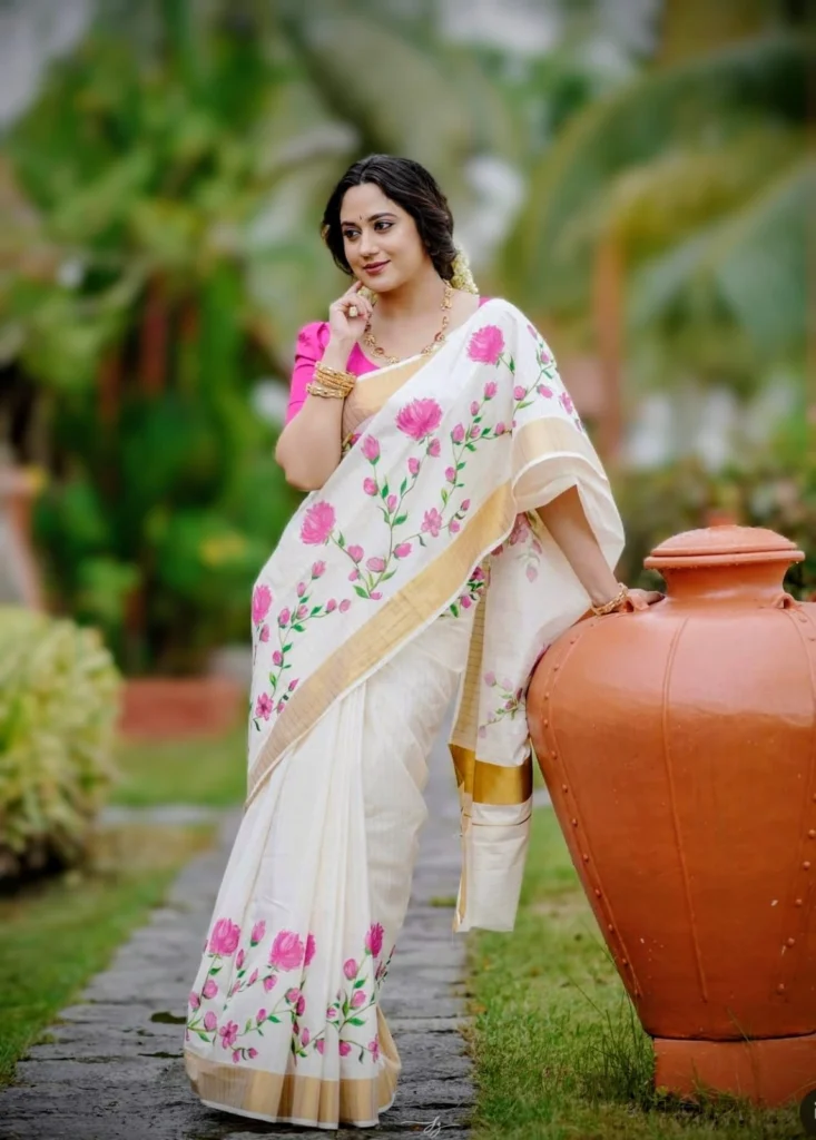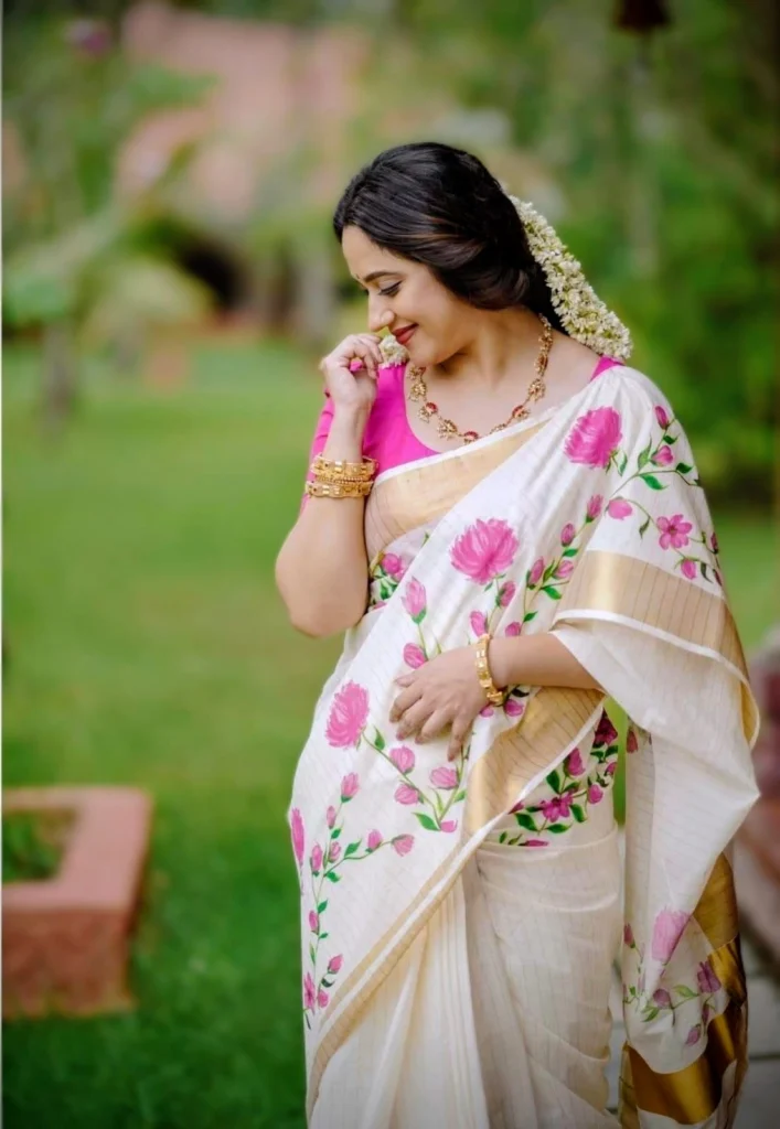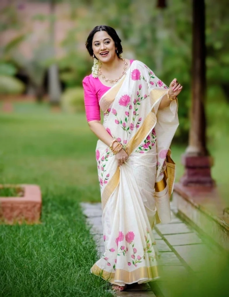 Kerala Cotton Saree with Lotus Floral Prints with Running Blouse