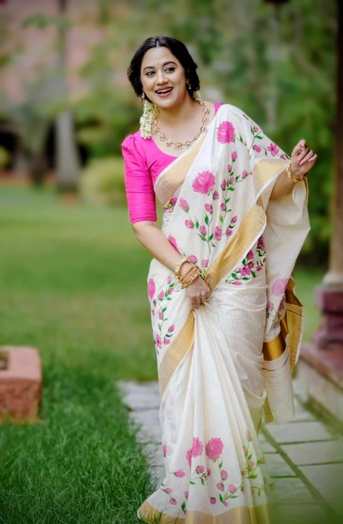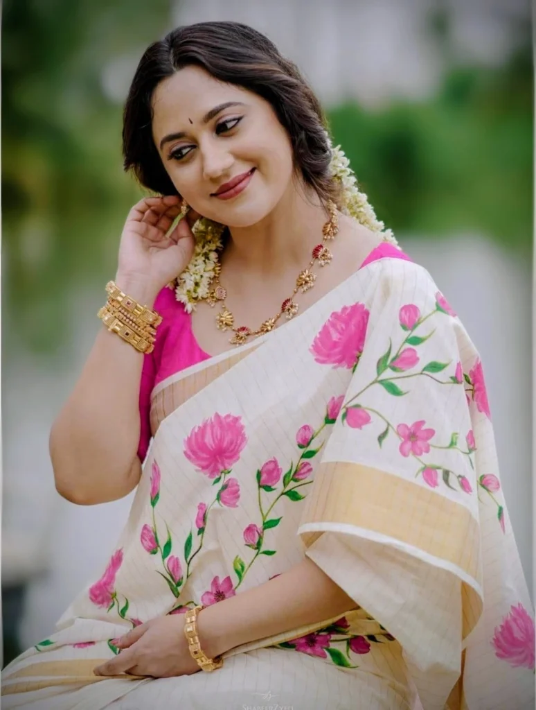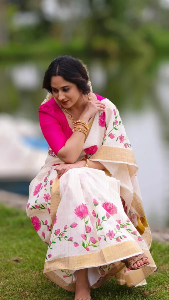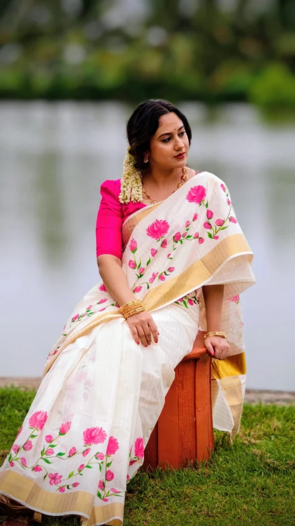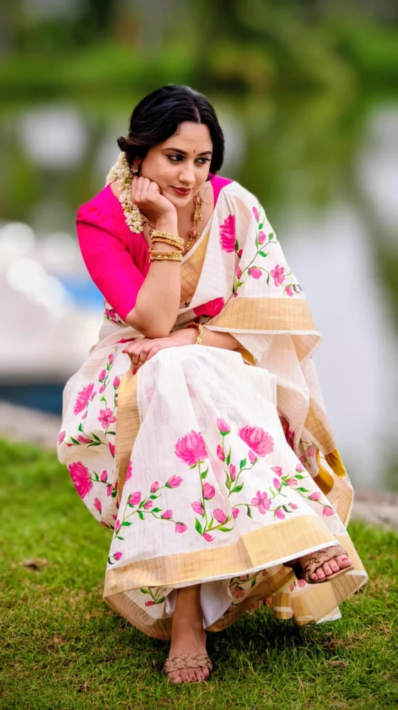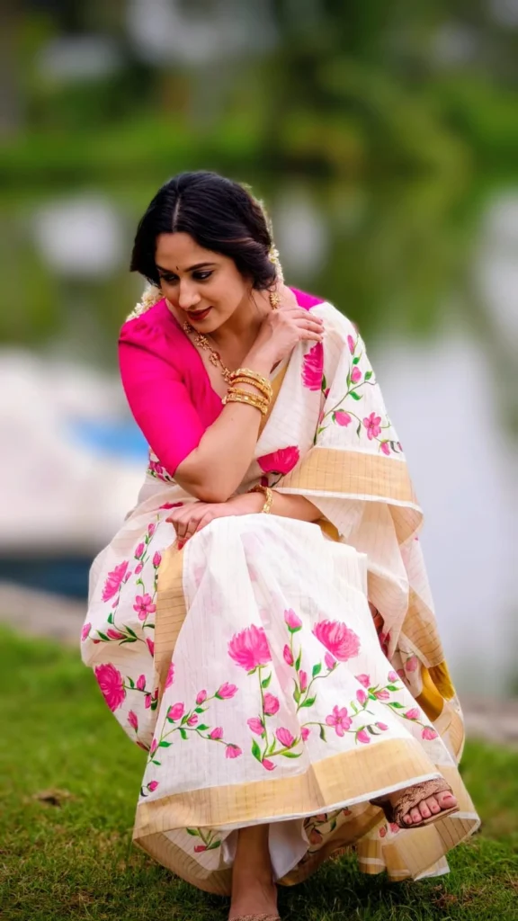 Kerala Cotton Saree with Lotus Floral Prints with Running Blouse